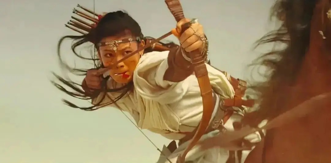 陈丽君,拥有越剧功底赋能实战招式,她马上下腰射箭、弯刀劈杀镜头惊艳,青蓝皮甲+游牧彩绘脸谱,强化西域女战士的气质!
